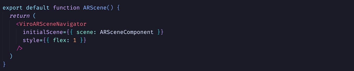 in our TSX file we create a ViroARSceneNavigator, this is the component that will become a view of your device’s camera In this component we set the parameter initialscene, this is the scene we render in our AR environment.