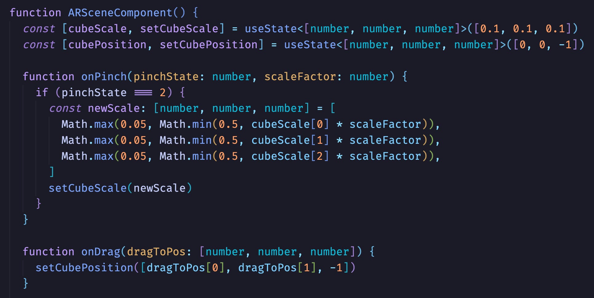 In our ARSceneComponent we can create interactivity functions like onPinch, when we pinch our object we would like it to scale, so we set the scale parameter in the same function. We create an use state (a function that controls the state of a component) for the scaling level and position of our object.