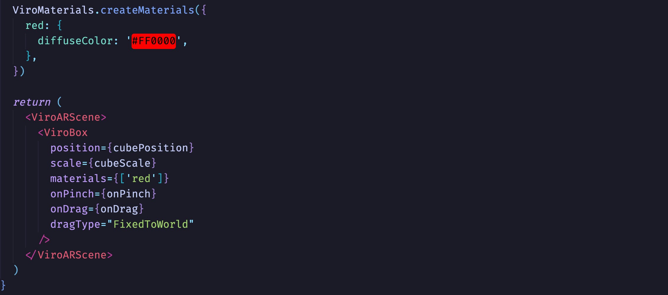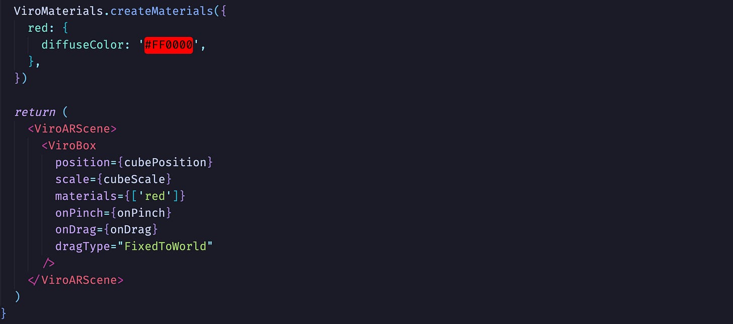 The only thing left for us to add a ViroARScene to our code, in this scene we create ViroBox wich is the object we can interact with.